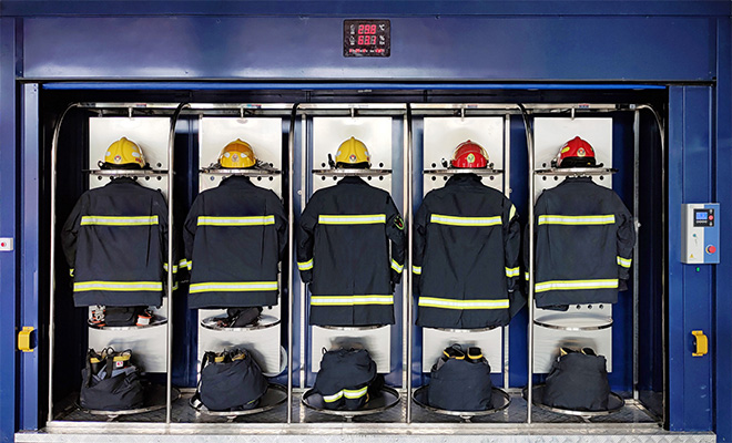 為解決高溫高濕季節(jié)消防服裝潮濕、穿著悶熱問題專門研制開發(fā),利用現有設施進行原地改造,通過智能控制實現消防服裝快速干燥、有效滅菌。