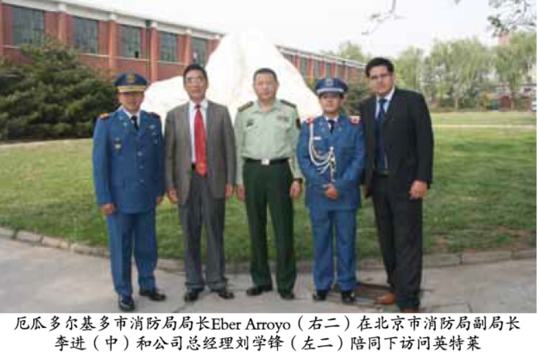 2013年5月6日,厄瓜多爾基多市消防局長埃貝爾·阿羅約(Eber Arroyo)中校攜夫人蘭迪·塞爾納(Landy Cerma)女士一行來北京英特萊科技有限公司參觀訪問,北京市公安消防局李進副局長及公安部外事局等相關(guān)領(lǐng)導(dǎo)陪同訪問。公司總經(jīng)理劉學(xué)鋒接待了埃貝爾· 阿羅約中校一行,雙方在公司第一會議室進行了交流與會談。